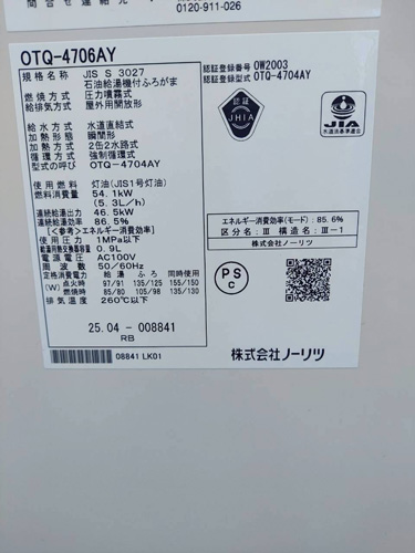 韮崎市藤井町 ノーリツ給湯器→ノーリツ石油給湯機付ふろがまOTQ-4706AY 給湯器交換工事